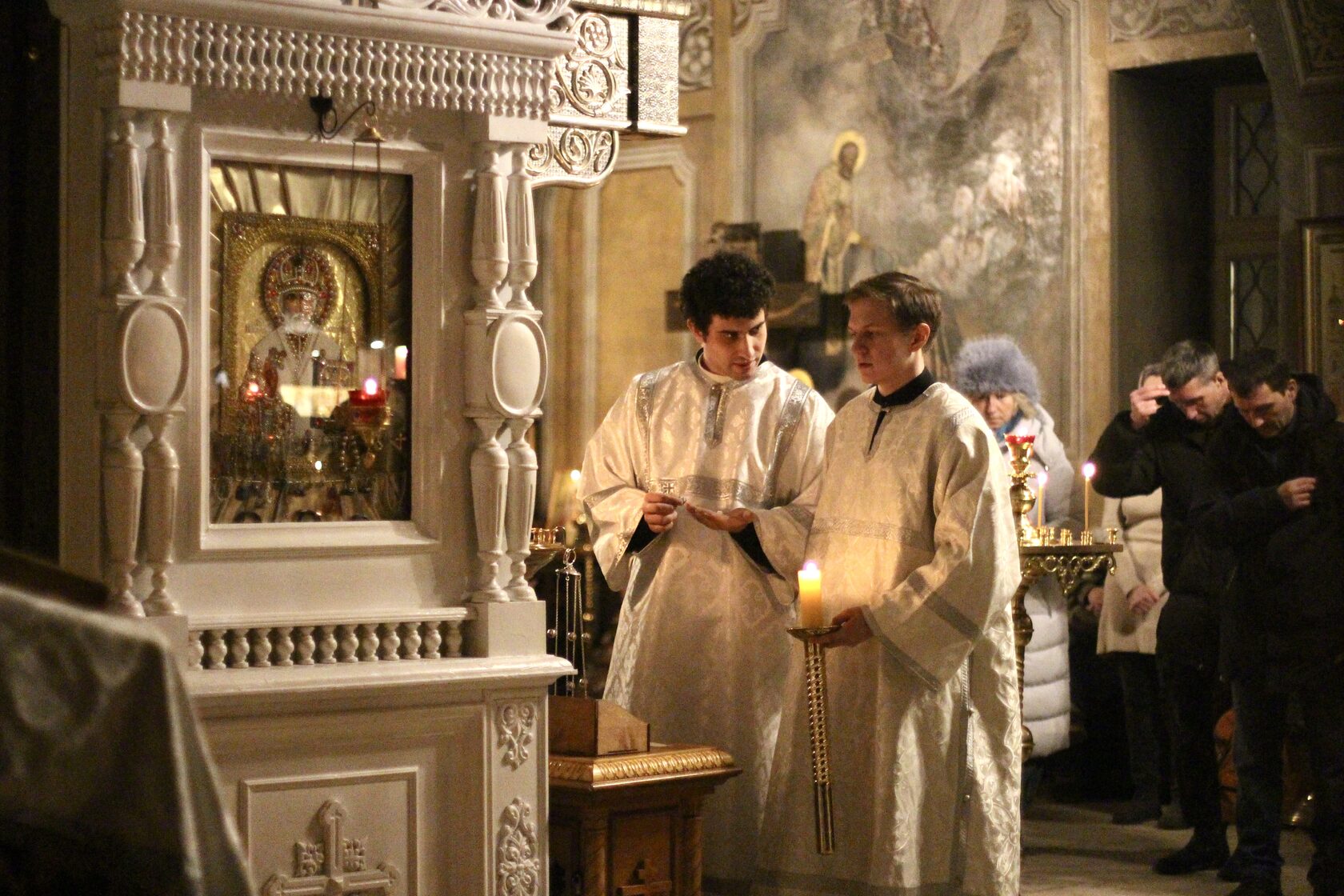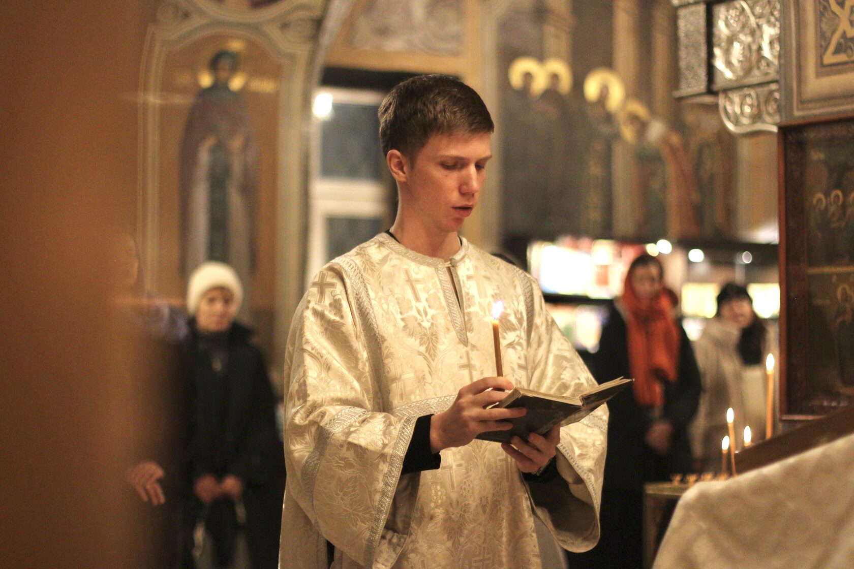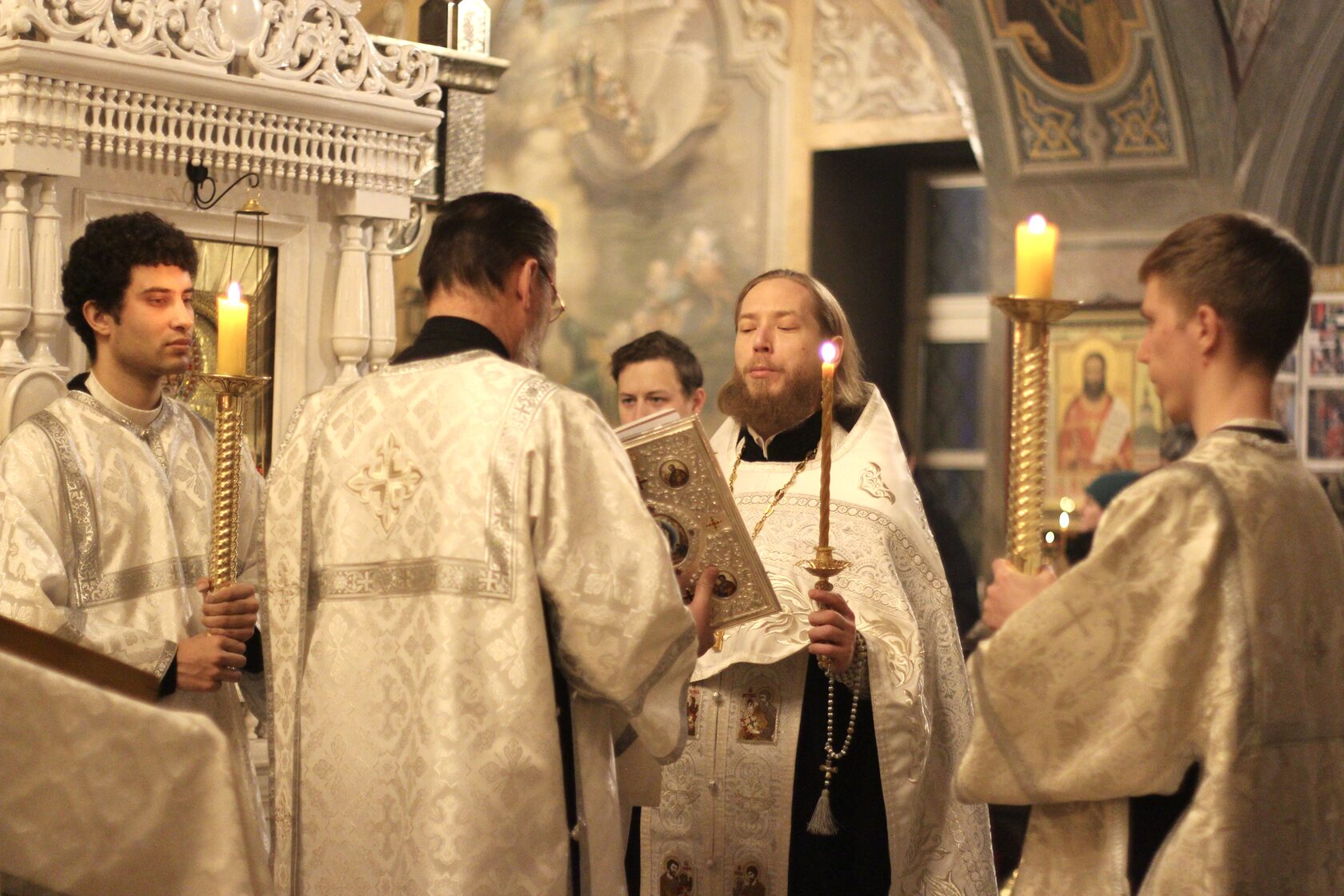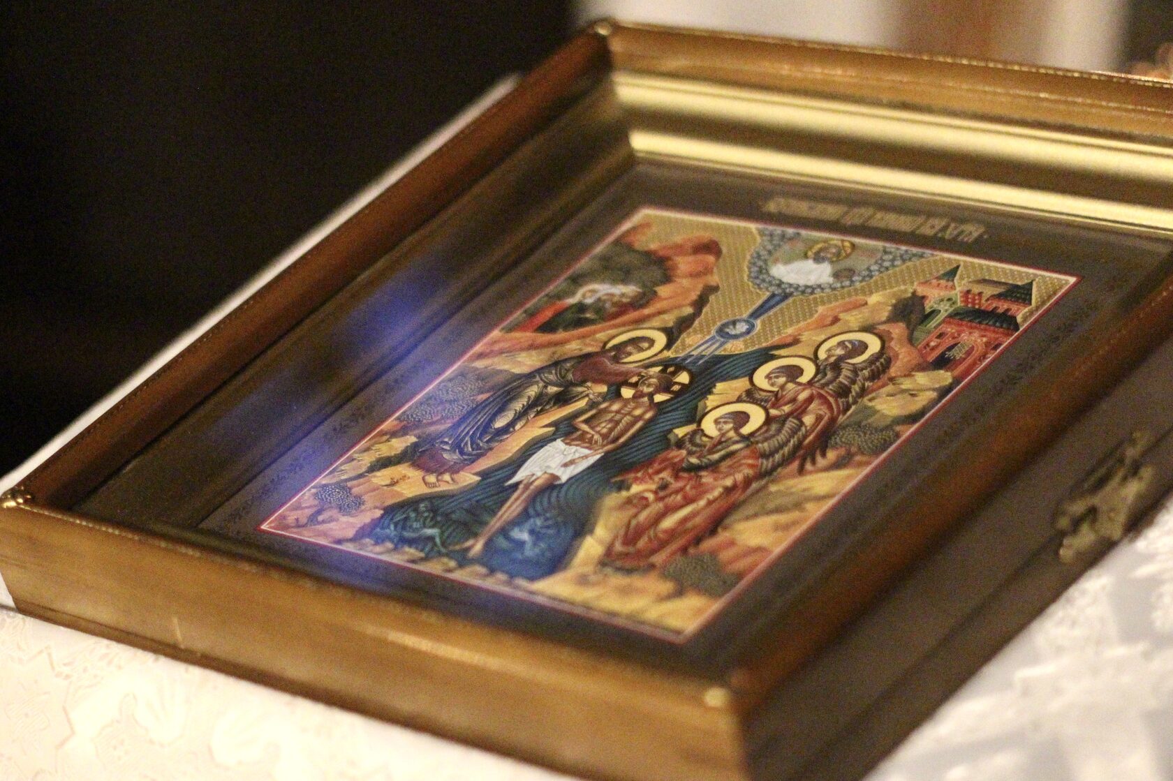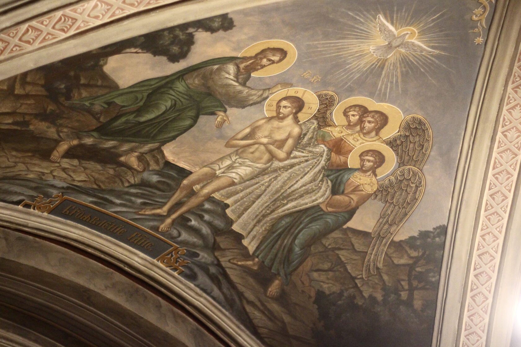 Перевод: Когда Ты, Господи, крестился во Иордане, люди узнали Святую Троицу, потому что голос Бога Отца называл Тебя любимым Сыном, а Дух Святой, в виде голубя, эти слова подтверждал. Ты, Господи, пришел на землю и дал людям свет, слава Тебе.