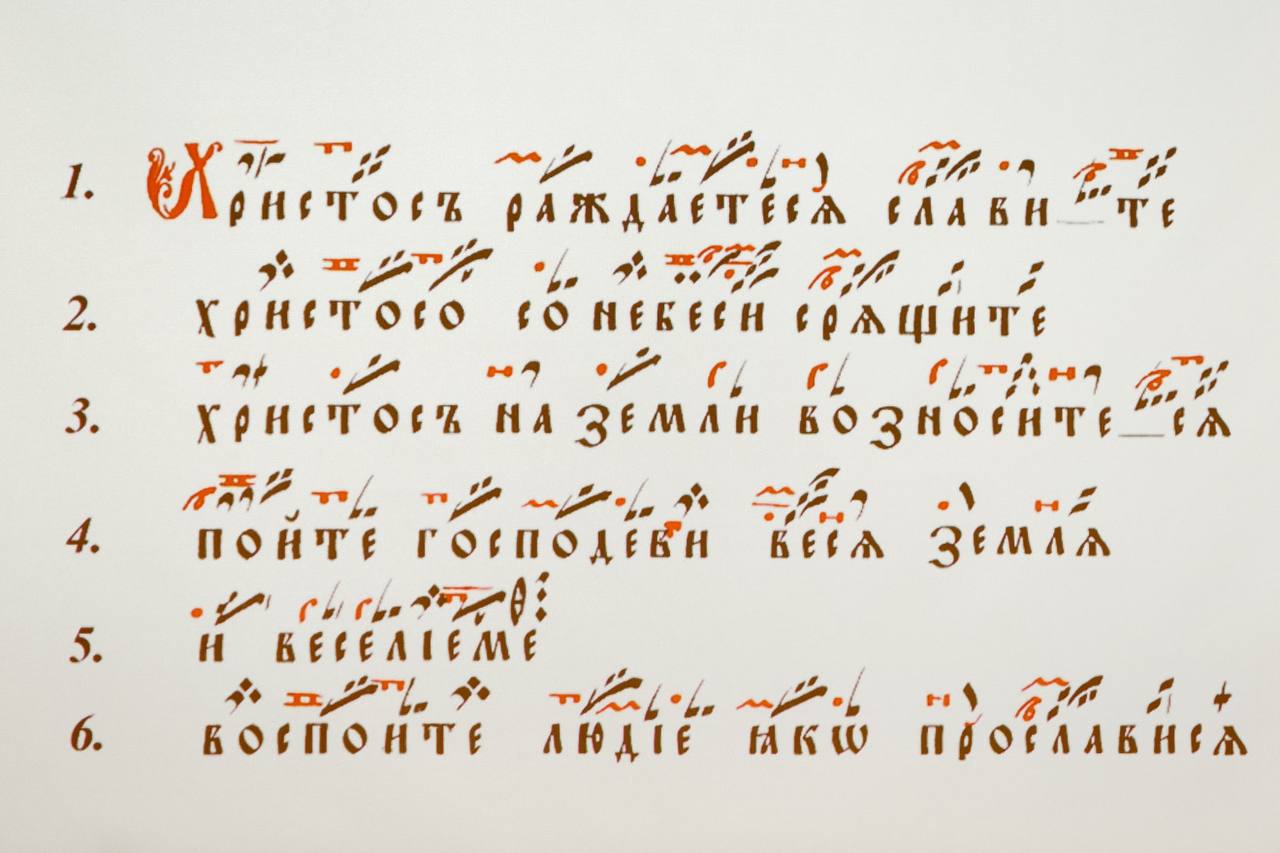 Христос раждается — славите, / Христос с Небес — срящите. / Христос на земли — возноситеся. / Пойте Господеви, вся земля, / и веселием воспойте, людие, / яко прославися.