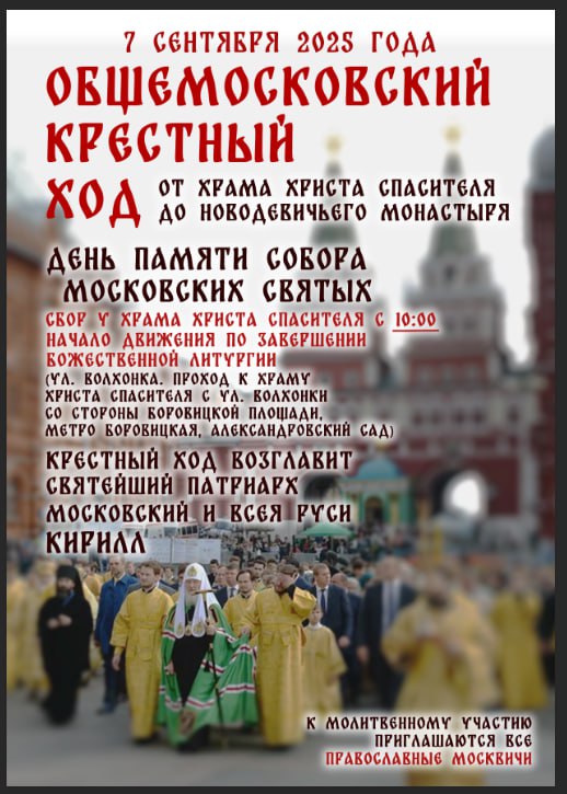 По благословению Святейшего Патриарха Московского и всея Руси Кирилла 7 сентября 2025 года, в Неделю 13-ю по Пятидесятнице, день празднования Собора Московских святых, состоится общемосковский крестный ход от кафедрального соборного Храма Христа Спасителя г. Москвы до Новодевичьего ставропигиального женского монастыря.